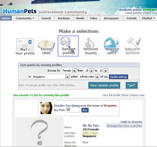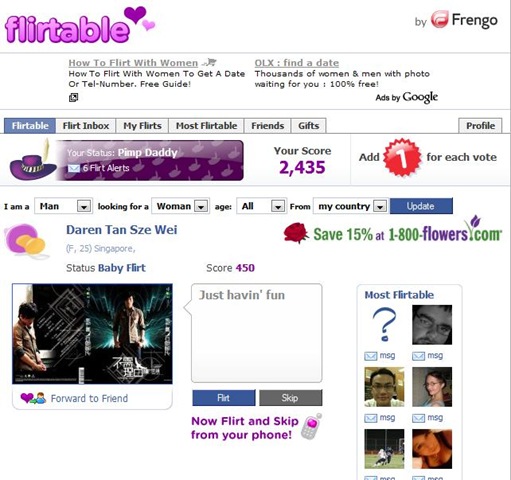 Applicationsi shall intro to you 2 application that will help you in your quest of finding cyber dates 1) flirtable This program allows you to browse profiles so if you don't like you can just press skip or if you like you can press flirt or msg the person so the person will receive the flirt alerts and see if he/she wants to reply you... Most will add them in msn too 2) Human Pet Human pet is about the same but then you will need points to buy people so you become their owner...